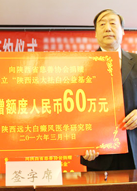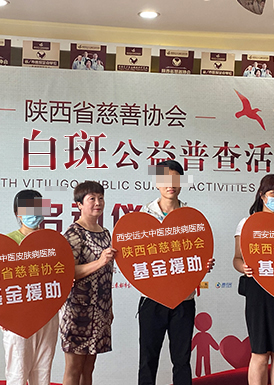汇聚仁爱之心、彰显慈善力量。我院为患者提供优质医疗服务的同时,更加注重贴心、细致的人文关怀,考虑到有很多贫困家庭的白斑患者,因为费用问题止步治疗,为此特与省慈善协会联合成立专项祛白基金,先后共捐赠120余万元用于祛白援助,连续举办了6季白斑公益普查活动,期间凡是符合条件通过审批的患者最高可获得10000元祛白基金,大大降低了贫困家庭患者的就诊门槛,真正做到让贫困患者“病有所医,医有所助”。并且经常组织医务人员入市到村,在西安、商洛、渭南等陕西省10市30县进行了260余次义诊活动,将预防为主的健康理论普及到了广大群众,切实将复色之责进行到底。